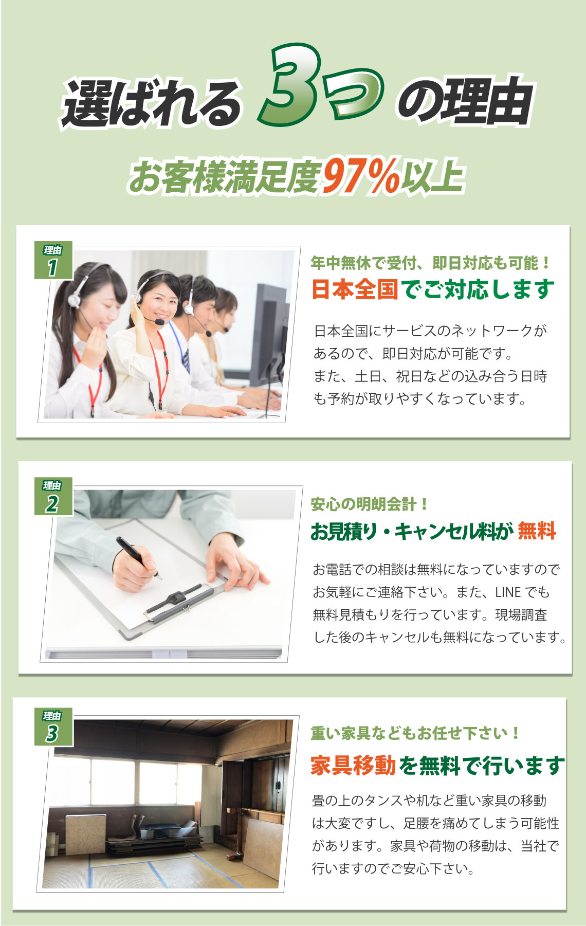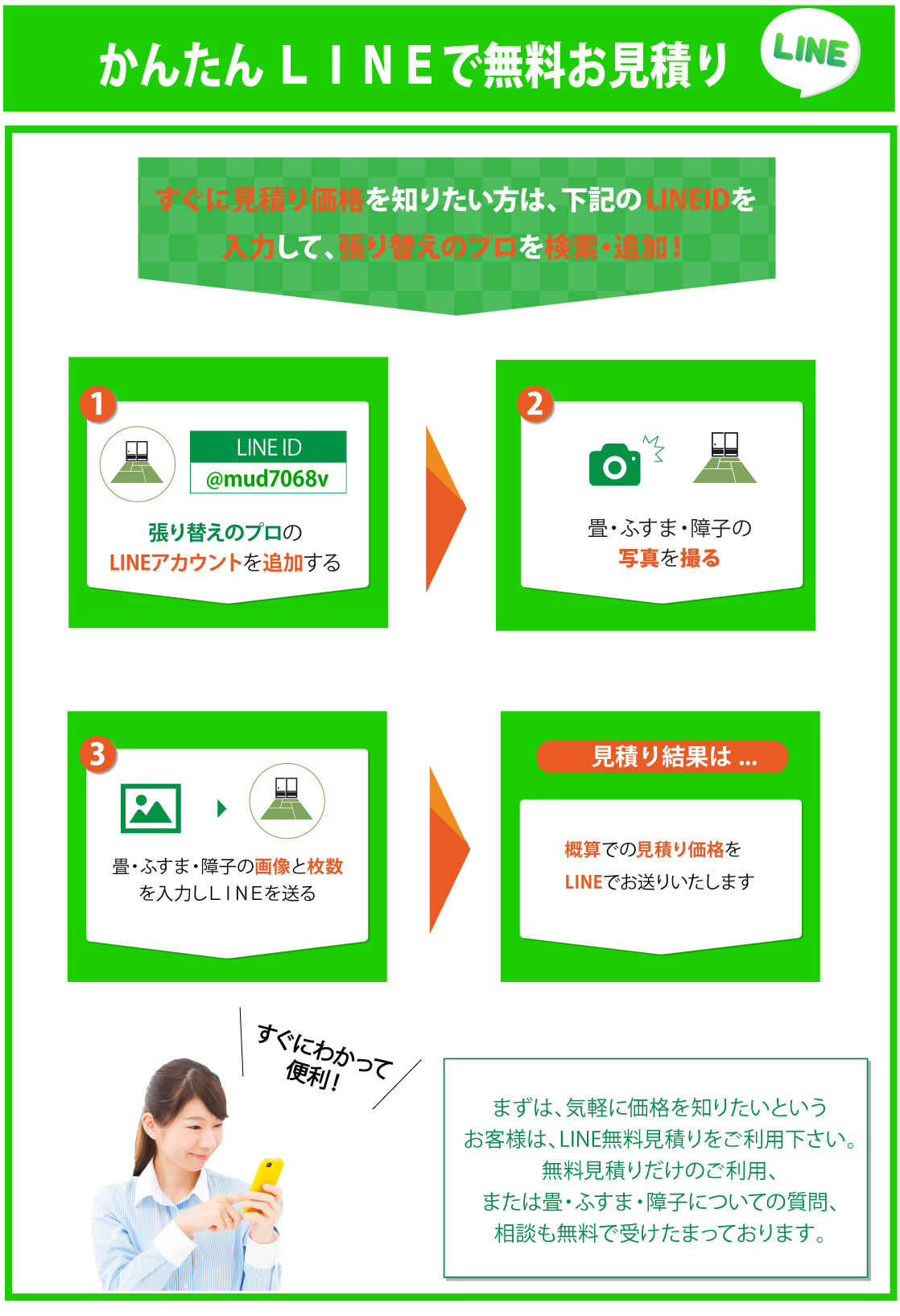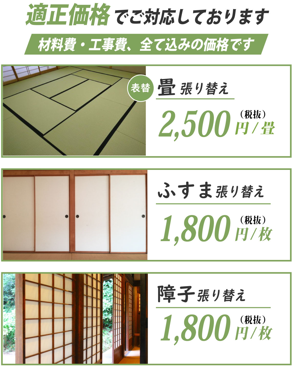 畳、襖、障子の張替えを考えた時、どういった業者に依頼すれば良いのでしょうか?どれくらいの料金がかかるのか、どういった対応を行うのかなど多くの心配がある方もみえるかと思います。そこで価格・対応・サービスなど業者を選ぶ際に知っておきたいポイントを押さえて、気持ちよく張替えを終わらせましょう。最初に気になるのは値段ではないでしょうか。出来うるものなら安価、低価格で依頼したいですよね。張替えの料金は、ある程度の相場は決まっていますが、一概に何円とはなかなか言えません。商品の品質や張替えの対応(畳であれば裏返し、表替え、新調など)で料金は変わってきます。そこで業者が商品や対応の説明をしっかり行い、最適な方法を提案してくれるかということを確認してみましょう。加えて、無料見積もりの利用をおすすめいたします。優良業者であれば、見積もりの詳細まで説明を行ってくれるので、追加料金の発生もありません。あわせて、業者の対応が親身であるかも見ておきましょう。こちらの相談や質問に対して、丁寧・的確・誠実に対応してもらえれば安心して張替えを検討できます。また、業者の技術・知識力も大切ですね。例えば、畳であれば『畳製作技能士』という資格もあるので問い合わせ時に作業員がそういった資格を持っているか確認しておきたいものです。他にもチェックしておきたいポイントがいくつかあります。商品の取り扱いが多い業者であれば、商品の価格や品質といった選択肢が増えて、商品選びがしやすくなります。また、小さなことですが、作業前の家具の移動、畳の拭き取りといったサービスを利用できると助かりますね。もし張替えでお悩みの際は、まずは気軽な問い合わせをおすすめいたします。安心できる業者であれば、小さな質問や相談からでも受け付けています。いきなりの問い合わせは不安という方は、業者によってはweb(LINE、メールなど)見積もり、相談も行っています。これらの知っておきたいポイントに気をつけつつ、満足のいく張替えにしたいですね。